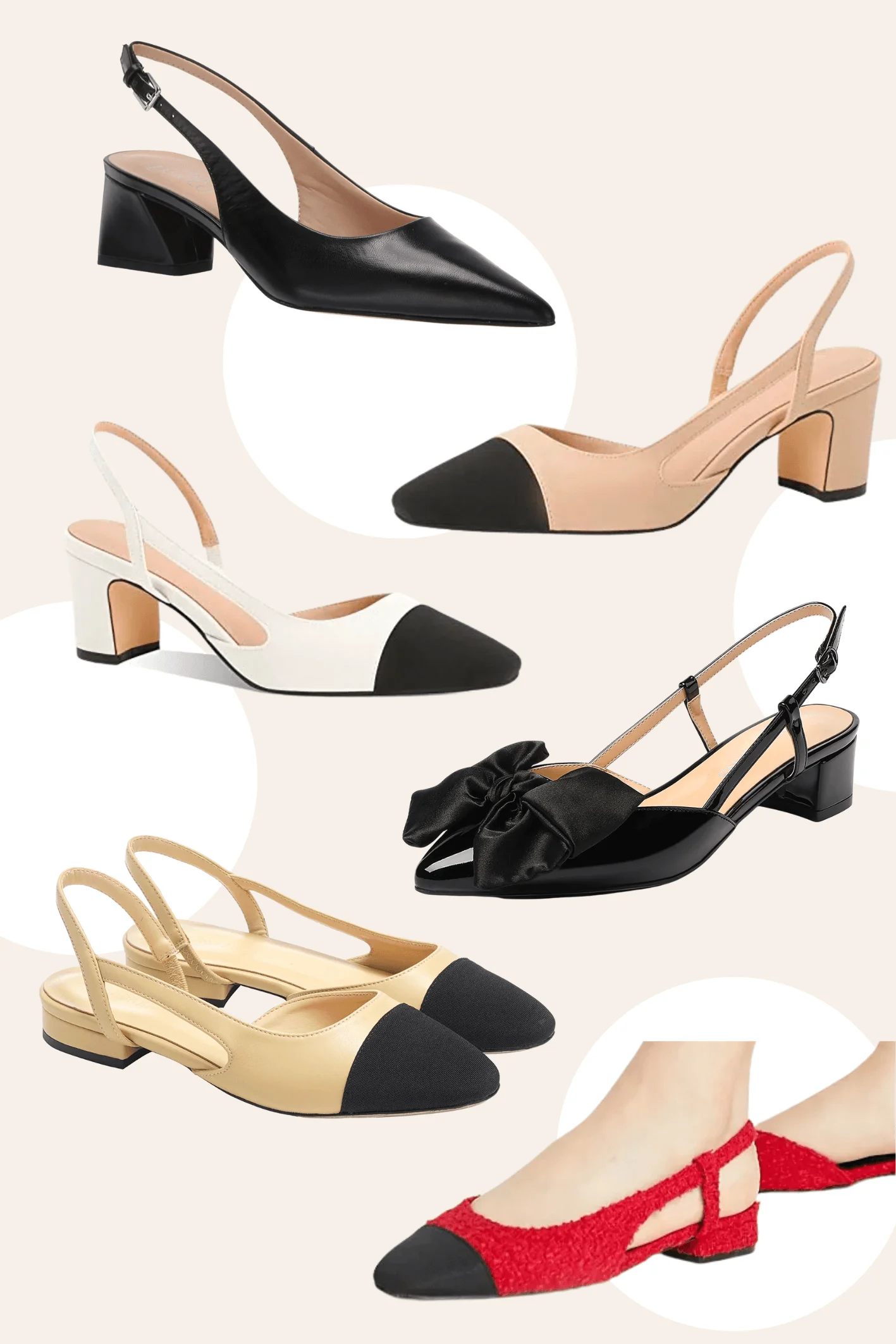 Up next, the Tweed Cap Toe CC Slingback Flats in White and Black are a trendy, textured variation of a viral Chanel style. For a similarly polished look, consider the $46 JiaBinji Slingback Flats. These Amazon gems feature a low heel, an elasticized ankle strap, and a sassy, secure slingback style.