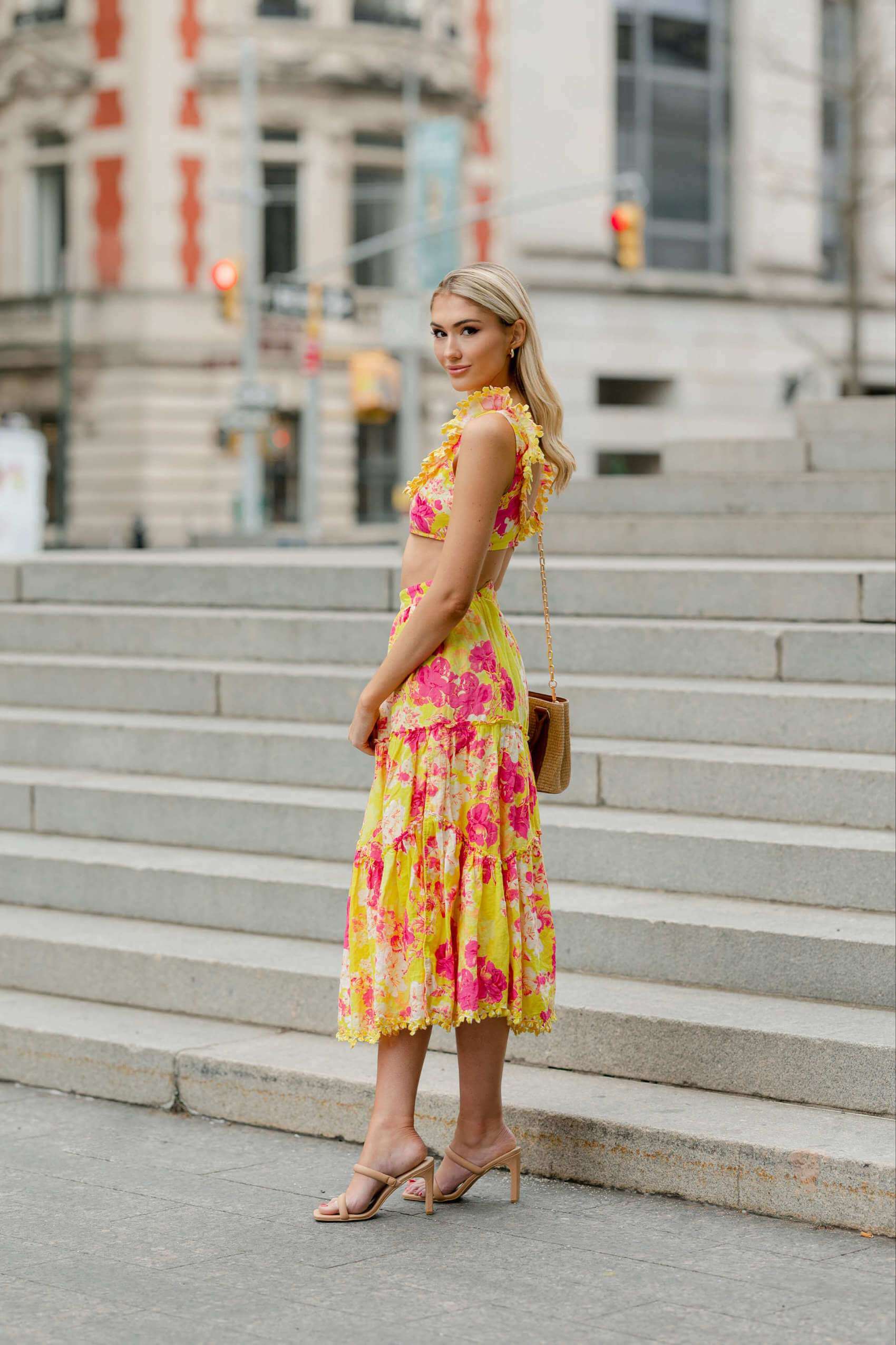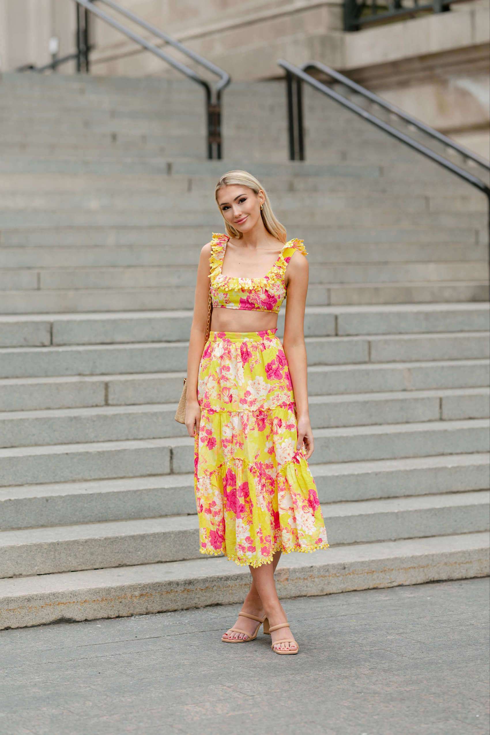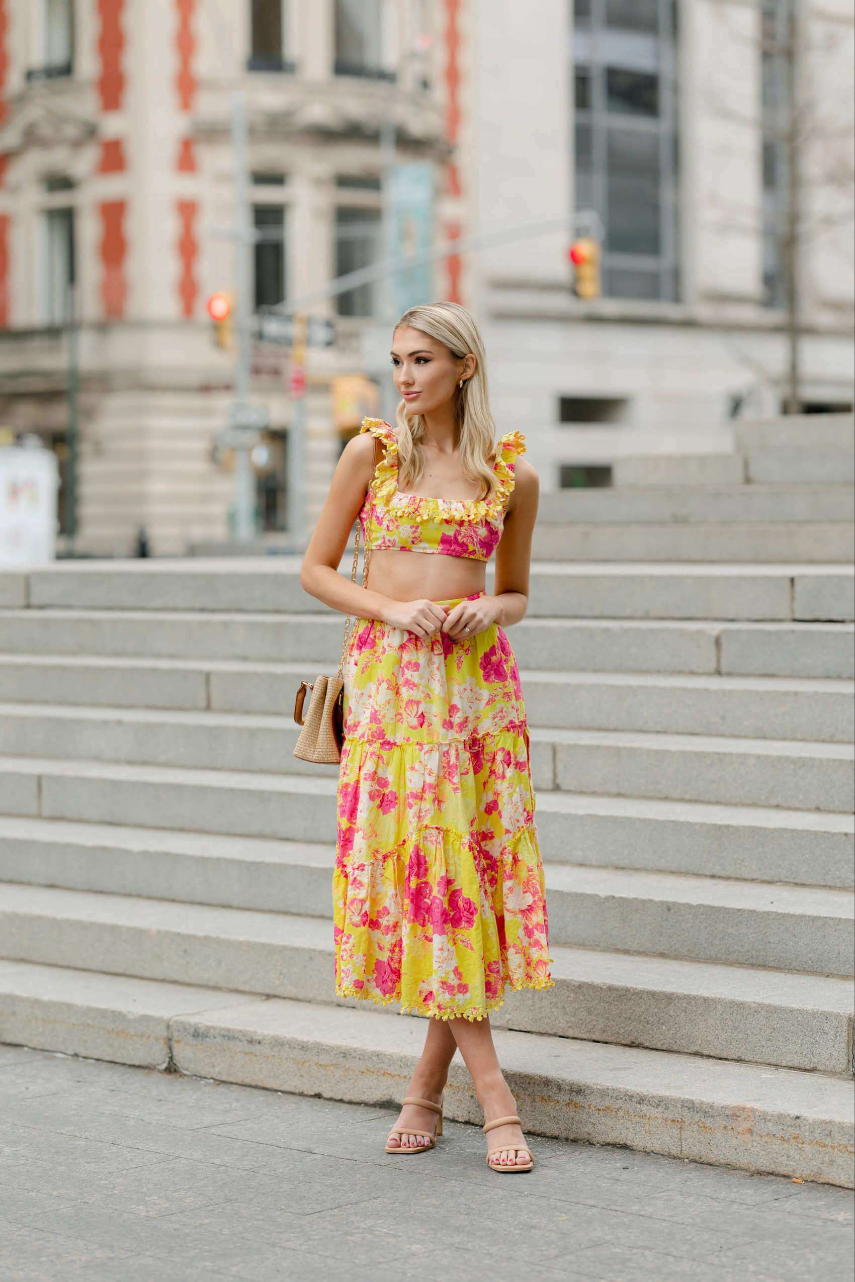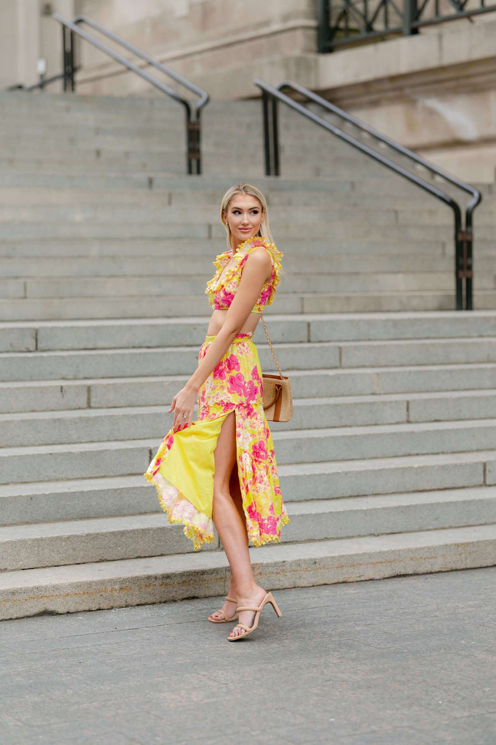 Feminine and flowy, two-piece maxi skirt sets are the perfect choice for a variety of warm-weather occasions. For a dressier date night, throw on a pair of heels and chic accessories, or opt for flats and a denim jacket for a more casual look. I love the bright colors and ruffled crop top in the stunning yellow set I’m wearing above!